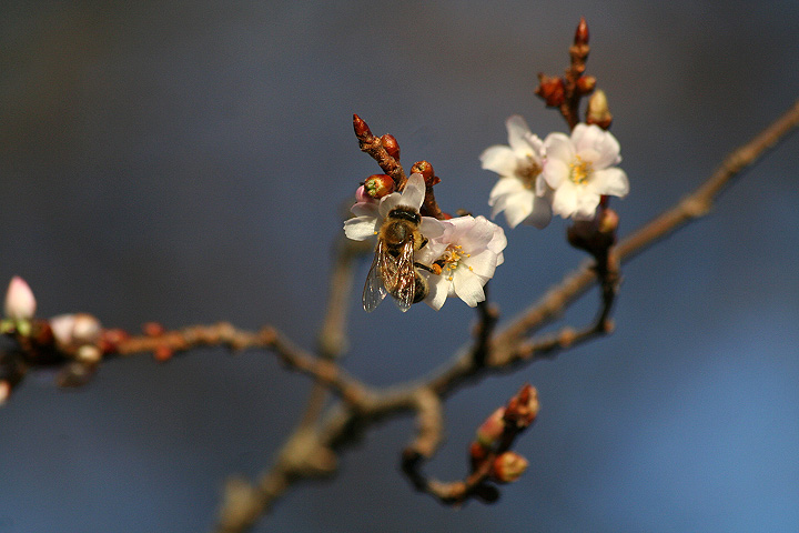 multiply that by a few hundred blossoms and you get a very pleasant smelling bouquet. the recent string of warm weather apparently was enough tricked these poor trees into thinking it's spring already. it wasn't just the trees that were fooled: there were also clueless honeybees, feeding on the nectar, pollinating the flowers in the middle of a new england winter!