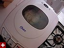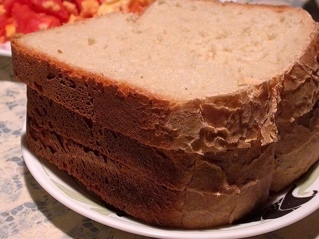 instructions were pretty straight forward: a cup and a third of water, 2 tablespoon of melted butter, 2 teaspoon of milk (they asked for "dry" milk, i just used regular milk), 4 cups of flour (i used special bread making flour), 2 tablespoon of sugar, 2 teaspoon of salt, and 2 teaspoon of baking yeast. i didn't realize i wasn't supposed to mix the wet and dry ingredients, since apparently it's important (not sure why) for the yeast to go in dry. after i added everything into the metal loaf-shaped pan, i put it into the baking machine, set how dark i wanted my crust (medium), and hit the start button. it was pretty fun watching the machine knead the bread into a large sticky ball. everything was automatic, i didn't have to do a thing. the machine made some noises, but i hardly noticed because i had the dryer running (which is much noisier). after it stopped kneading the dough, it stopped to let the bread rise, and then started the baking. it was pretty interesting, i've never actually seen bread made before, so it was all new to me. 3 hours later i had a loaf of bread, the size and shape of a small toaster oven. my father came by just when i finished baking and we taste tested the fresh bread. it tasted like french bread, with a hint of sourbread. there was a lot of crust but that's my favorite part of the bread. i think tomorrow i might try the express bake setting, where a loaf of bread can be made in about an hour. the bread machine is really just a novelty, since i'm not a big bread eater. there are recipes for other kinds of bread, which i might attempt to make in the near future. i can now add bread making to my list of things i've done (although with a machine, so that's probably asterisked).