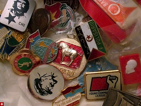 our meeting wasn't just to eat wings however; it was also a belated christmas as we exchanged presents. i always give the worst gifts, and this year was no exception as i gave many an almanac. manny in return gave me a wad of tissue paper stuffed with communist pins. they came from daisy's parents' basement (their family was originally from vietnam) and daisy was going to throw them away but manny saved them for me. it's a like a time capsule, pins from china, vietnam, and the soviet union, as well as few others, like frente polisario (western saharan independence movement).