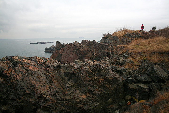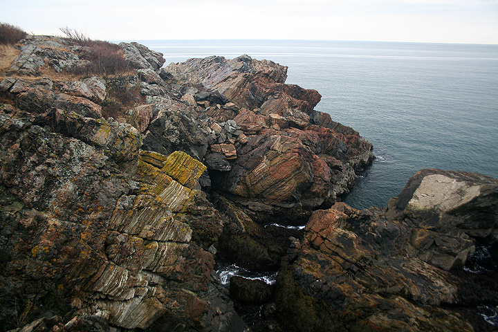 motivated by a need to find a bathroom for jesse, we walked through the fence (despite the numerous "no trespassing signs") into east point, home of northeastern university's marine science institution. thinking that maybe we were the only ones there, we actually bumped into quite a few people (which made it difficult for jesse to find a suitable outdoor commode). we were even more surprised to find that the place was in fact a local park, with well-managed trails for walking and wooden benches for resting. the view was amazing, although a little dangerous since one false step could drop you into the craggy rocked oceanside abyss down below.