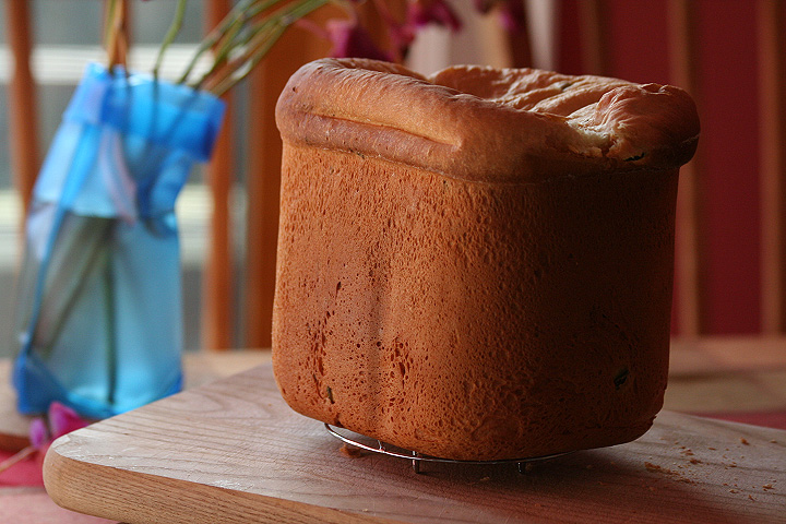 i think it had something to do with the cheese, something else for the yeast to feed on besides the sugar. my father came by briefly to get me to burn a dvd for him, but after waiting for about an hour, i messed up the burn so he left. he also took the bread with him, which by then was all ready. the top of the bread had collapsed (first time this has happened) but other than cosmetic damage, the loaf was fine. the jalapeño peppers naturally made it pretty spicy and i cut myself a little bit before giving the rest away to my father. tomorrow: cottage cheese and chive bread!