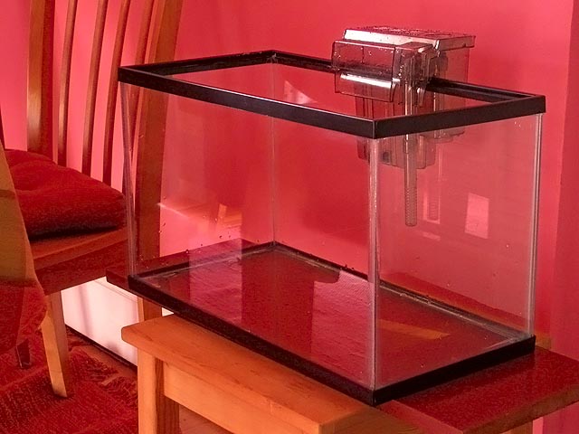 i was asked to wait downstairs while she went up to get the aquarium. for $15 i got a 10 gallon glass (heavy!) tank along with an empty whisper power filter and a proquatics 50w heater. if i was to buy everything new, it'd probably be around $50. the aquarium didn't come with a hood so i still have to get that, as well as a fluorescent light tube. then there's the gravel and the plants and eventually the fish.