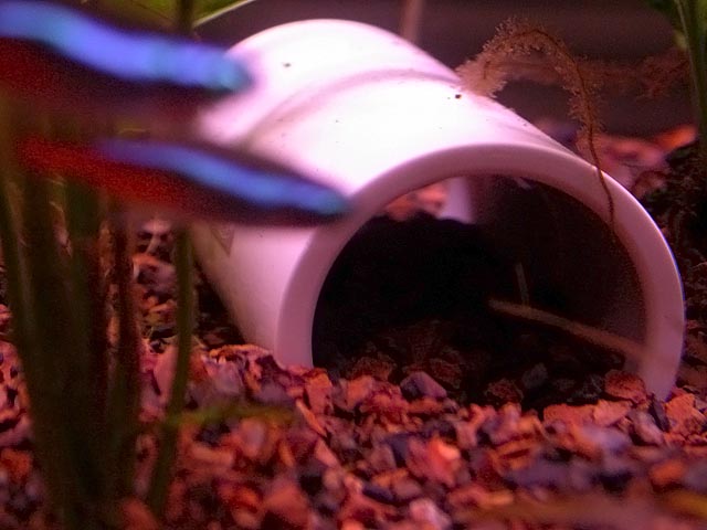 back at home i put that piece of tubing to good use, taking out the two sake cups and replacing it with the plastic tube to form yet-another a makeshift cave. once more, i didn't see any baby guppies taking advantage of the shelter. back to the drawing board!