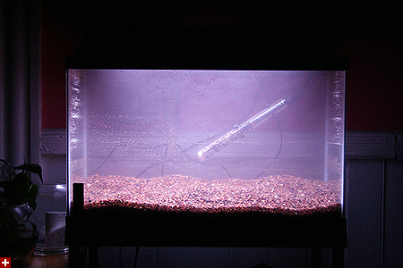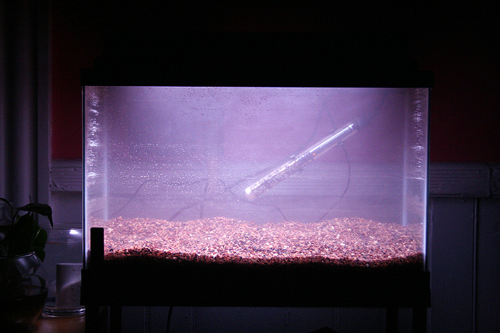 the aquarium was still cloudy so i added some clearing droplets. in about an hour, it went from cloudy to partially clear. there was a crater in the gravel bed from where i poured the water, so i re-adjusted the substrate but ended up kicking all that dust back into tank, re-clouding the water. i also added the heater because the water was freezing. 2 hours later i went back to check the tank and it was back to partially clear again. however, the water temperature still seemed cold. if the temperature doesn't go up to 74 degrees by tomorrow, i'll know i'll have to get a new heater. after that, whatever savings i made from buying a used tank will be negated.