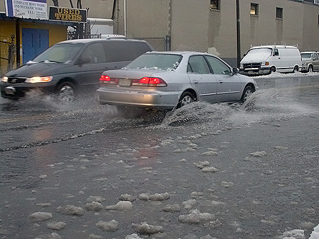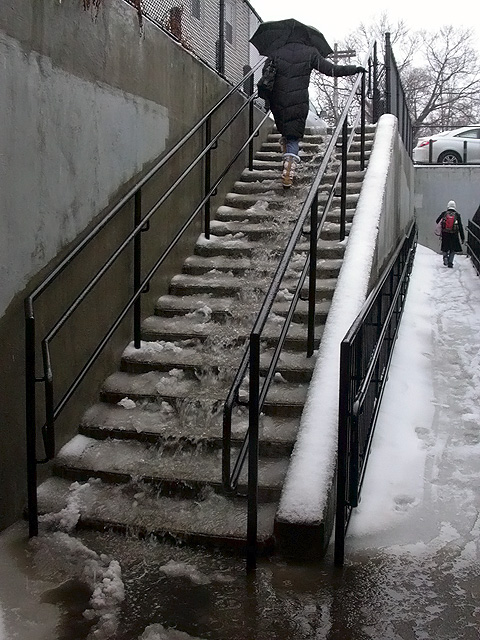 compared to today, yesterday was a beautiful day despite the cold. by the time i went out to shovel the slush off of the sidewalk around 4pm, it was already frozen. i had to chip at the ice with the tip of the broken plastic shovel and what i could pick up was heavy and wet. it was raining throughout, my jacket was soggy and my hands underneath the soaked gloves were so cold i thought i'd lose some fingers. it was quite a workout and i stopped often, picking my head up to see my other neighbors either digging out their car or clearing the sidewalk. after i finished, i went to the dollar store to get some toilet paper and kleenex. there were so many icy puddles that i just gave up trying to keep my feet dry, plunging ankle deep into the slush. crossing the underground pathway, water from somerville avenue was flooding into the tunnel from the stairwell. portions of the street were submerged in water, little miniature icebergs floating on the surface as cars sped by splashing ice water everywhere.