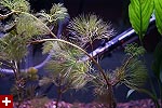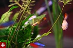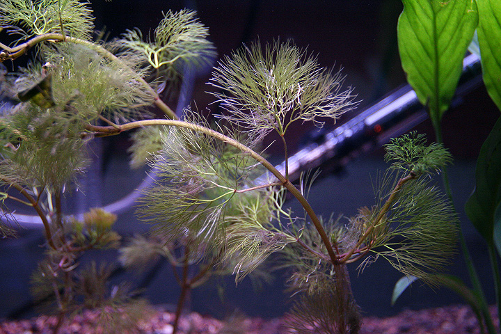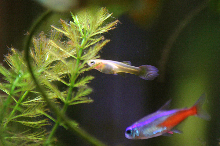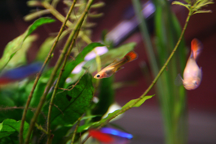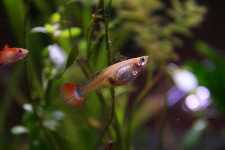 i've been trying to get a good photo of the little guppy. it's definitely a female and has a flashy tail fin characteristic of guppies. the other two adult females both have white patches on their tail fins, but this little guppy has black coloration, which none of the other guppies have. it's also interesting to see how much it's changed from a week ago, when it was just starting to show some colors. even the damaged ends seemed to have healed now. back to the two adult females: are they pregnant again? this near constant pregnancy can't be good for them and i wonder if the males will outlive them. at the pet store today i saw some of the other guppy varieties, and they were pretty amazing. the ones that i have are very plain compared to some of the more elaborate specimens. in plants news, that mysterious vegetation currently sort-of growing in the minibow is a bacopa but i don't know which kind (probably moneywort). and the frilly plant? it's called a milfoil AKA frill plant (that's a real name, not just something i made up).