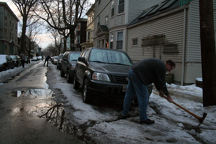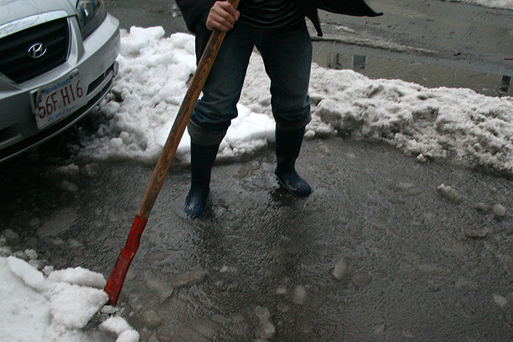 i dug a canal which led water from the street onto the pool of slush directly in front of my house, and then into the drainage. the sound of water trinkling into the sewer was music to my ears. later bruce came out to help me dig another canal, armed with a heavy iron pick axe. he worked on creating yet another canal on the other side of the street, as we cleared up another puddle of water. as a matter of fact, down the length of our streets, people were doing much the same, digging out their car after work, taking advantage of this momentary thaw. it seemed strange that this sort of clean-up service isn't provided by the city; if anything, cambridge should be paying us! for all my troubles, i got a tic tac sized blister on my right palm. i'm going to nurture it into a pretty callus.