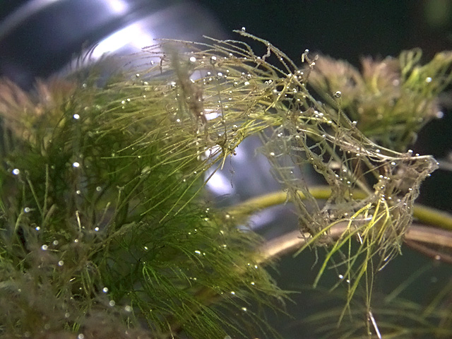 changed out a quarter of the water from the minibow and almost half the water from the 10 gallon. there wasn't any good reasons to change the minibow water, i just wanted to clean some algae off the glass and figured it'd be a good opportunity to add some new water. plus, i noticed the guppies were all clinging near the surface, and i was afraid maybe the pH was dropping again (although there's no reason it would, with plenty of plants and good filtration and seemingly clean water). when i removed the lid, i got a good view of the fries and to my surprise i counted 11 babies. did one of the females give birth again? as for the 10 gallon tank, there's just a lot of dust sediment on the substrate itself, and i wanted to vacuum clean some of that gravel. after refilling the tank, i came back to check out the aquarium an hour later and noticed beading on all the plants, both the frills and the brazilian sword. beading is the telltale sign of photosynthesis at work, as the plants use up carbon dioxide and release oxygen in the process. i've never seen beading before in any of aquatic plants so this was a good sign that the carbon dioxide is working. nevertheless, the frill plants still look like crap, like they're deteriorating, but i hope this is temporary. at this stage it seems like the frill plant is desperately trying to send out new roots, looking for nutrients. my shipment from petsmart should arrive tomorrow, including some aquatic undergravel fertilizing tablets.
