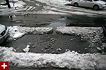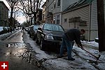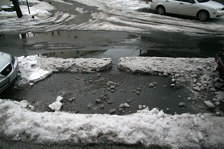 feeling particularly manly and desiring a venue to showcase my brute strength, i went outside with my rubber boots and the flat-tipped spade to chisel out some ice. my neighbor renee was outside doing the same thing as well, and we were wondering about the car parked right above the storm drain,
