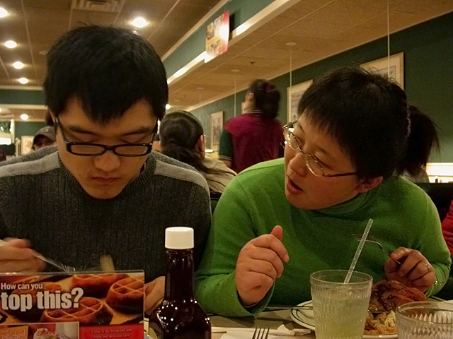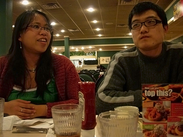 the foods not even that great, no better than your standard caferia food, and it's totally about quantity and not quality, showcasing the worst of america, things like obesity and wasteful consumption. nevertheless, there we were tonight, a farewell dinner before an tao's wife flies home. my sister arrived a short time later after finishing up her nanny gig for the evening.