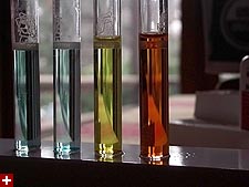 now the water in the current 7 gallon minibow aquarium is a textbook case of proper fish tank water chemistry: a neutral pH level (7.0), no nitrite, some trace of ammonia (don't let the photo fool you: the final color was more yellow than green), and some nitrate (which is normal, anything below 40.0 is okay). i'm actually pretty happy to get these results, like getting back a test with an unexpected A.