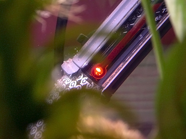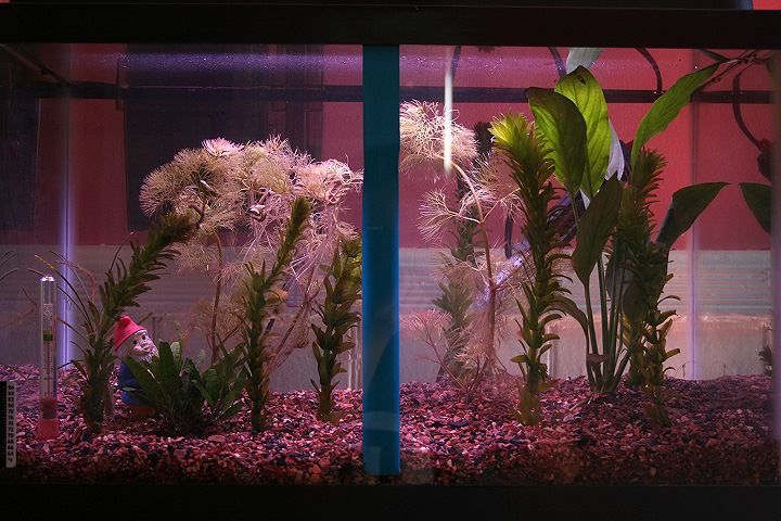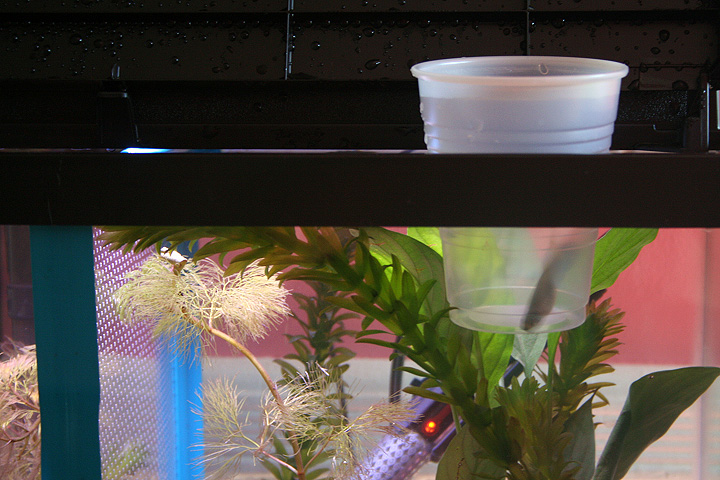 after a check of the pH (7.0 neutral), i finally decided it was time to relocate that one sick female guppy into the new 10 gallon tank. capturing her wasn't hard, as all the fish swarmed to the surface of the minibow, thinking it was feeding time again. with a plastic solo cup i dipped it into the water and the suction created by the filling water pulled in the guppy. inside the new tank, she swam around up and down a little bit before resting near the surface. i also buried some iron-rich fertilizing tablets in the hopes of helping the plants thrive since now i'm not using a carbon dioxide injector anymore.