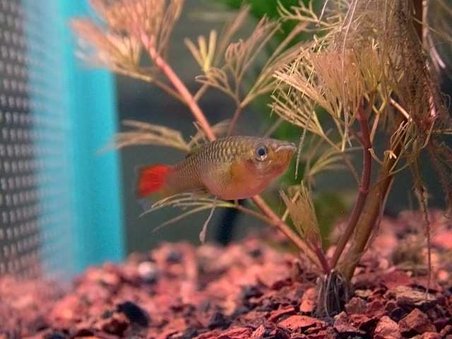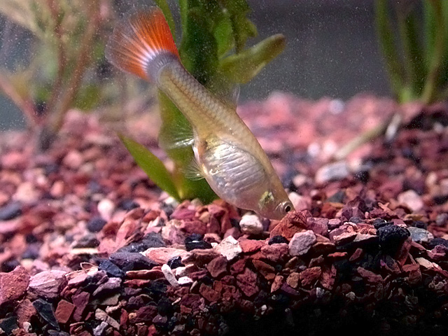 i sprinkled some freeze dried brine shrimp into the tank as a house warming present. while the males were happily eating, the females huddled in the far corner of the tank above the heater. after a few minutes though, they slowly reacted to the presence of floating brine shrimp and ate a little bit. that's when i noticed something different with the sick female i'd relocated earlier: she was missing her ventral (pelvic) fins, the fish equivalent of our legs. i couldn't tell if they were chewed off (there didn't seem to be any damage) other than the strand of while filament coming out of her anus, which after careful examination i believe is just a piece of constipated waste. if it was an injury, how did it happen? caused by the other guppies, or self-inflicted? maybe it's a genetic abnormally i never noticed. whatever the case, after the relocation, she seemed a little happier without the males constantly pestering her, but she still seemed kind of lethargic, preferring to hover either near the surface or down by the gravel. and when she swims, it's kind of this wiggling motion that uses just her tail fin. occasionally i see the males and females trying to touch either each between the tank divider (since they can see and smell one another), like a scene from a prison. i think the healthy female is also pregnant again, maybe i can expect more babies in the coming weeks.