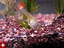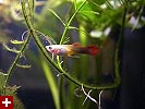 while on the phone with my mother, i saw something horrible happen in the minibow. a fry was swimming near a male guppy, who was hanging out near the surface, hungry for food. suddenly it snapped at the baby fish, which either killed it or stunned it. the guppy then bit again, and swallowed the baby whole. i wasn't even listening to my mother at that point and just hung up the phone. i couldn't believe it. the guppies and fries were coexisting peacefully for the past few weeks, and i often see them swimming with each other. the fries became quite fearless since the adults posed no danger. the first batch of fries that were born, something must've happened to them because only of the original 10 only one survived. the adults probably ate them, but since i never saw it happening, and the thought is just too disturbing to be real, i sort of rationalized to myself that maybe the fries died on their own, maybe as a result of bad water chemistry.