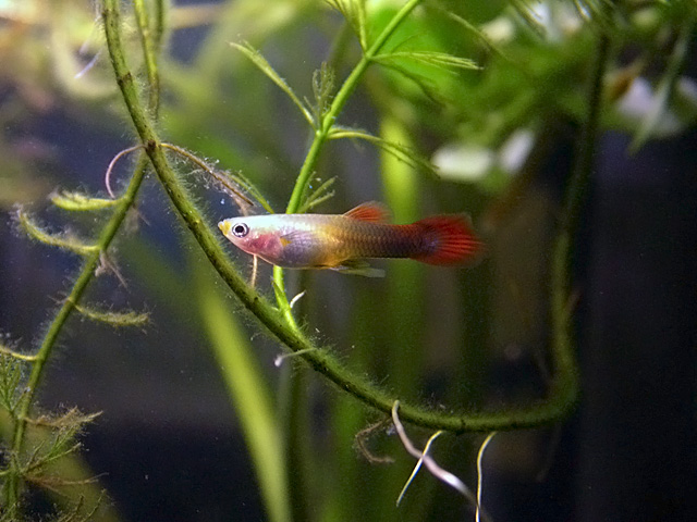 however, after seeing an adult actually eating a baby, it drove me to action. i grabbed my fish nets and pulled off the hood, determined to relocate the adult guppies so the remaining fries can have a chance to survive to adulthood. this time around it was harder to catch them, since they learned from the previous occasion that i wasn't going to feed them, so they were all at the bottom of the tank. the first one caught was a male, easily netted and dropped into the plastic cup. the second was the other female, which carried on a spirited chase, darting from one side of the tank to the other, until i finally trapped it in a corner. i caught the remaining male using two nets. i put the males on one side of the 10 gallon (the side with the filter, i figured they could use the exercise) while the females on the other (the side with the heater). while the males were busy exploring their new home, the new female seemed to be in a state of shock, hovering near the surface of the water. she so was traumatized by the whole experience that i could touch her with my finger and she wouldn't swim away.