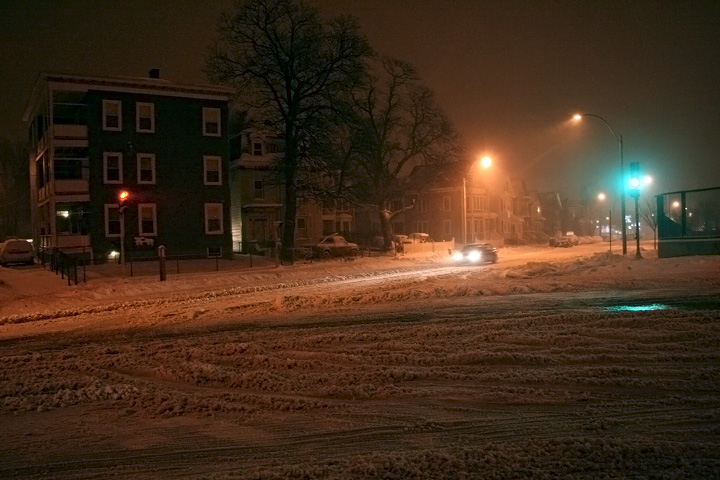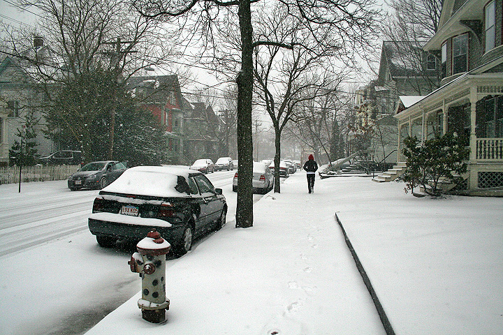 by the late afternoon i went out to shovel the sidewalk (first of many shoveling) before meeting bruce to take a tour of the wintery landscape. the snow, though light, came down at a pretty good clip - fast enough that after shoveling a new layer of powder would soon accumulate. there was also a great deal of wind, which would become a factor later.