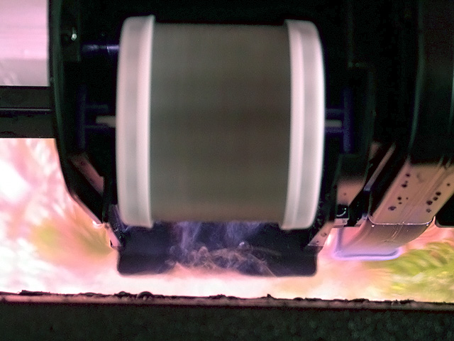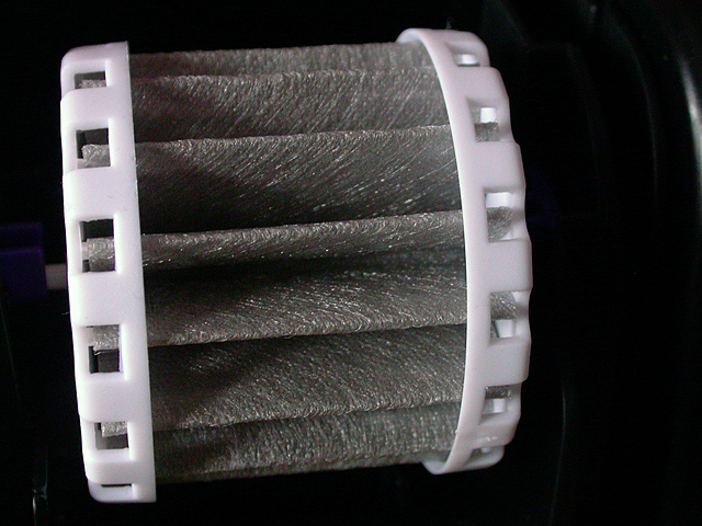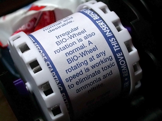 it took a few moments for the biowheel to turn but once it did it added a certain rustic charm to the aquarium. the water cascading from the wheel was distractingly loud, but once i put the specially-designed cover on the wheel, it was relatively silent, with an occasional gurgle. (bonus: watch a homemade quicktime movie of the biowheel in action). once the guppy tank was finished i moved on to the 7 minibow. vacuumed the gravel, replaced 2 gallons worth of water (with heated ammo-locked water), and scrubbed the walls of algae. the old water from the minibow was cleaner than the guppy tank (which makes sense, i clean the minibow more often).