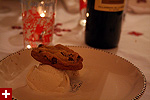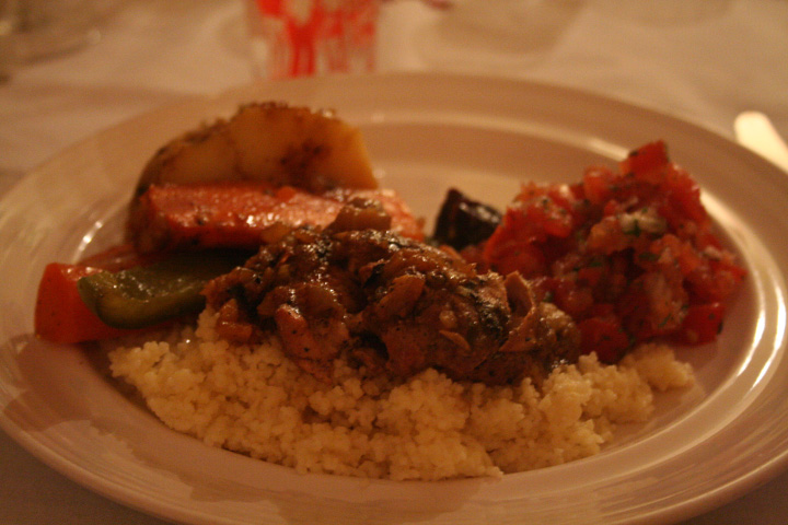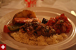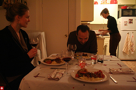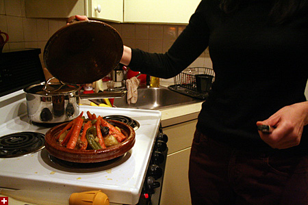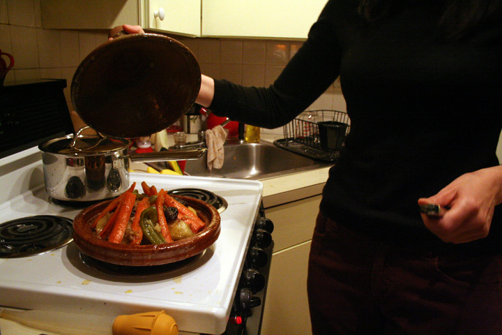 besides the hostess, eliza was there as well as their co-worker stephen. jerica, just back from morocco, made tagine, a moroccan dish. she made it in a special slow-cooking pot (also called "tagine") shaped like a cylindrical pyramid.