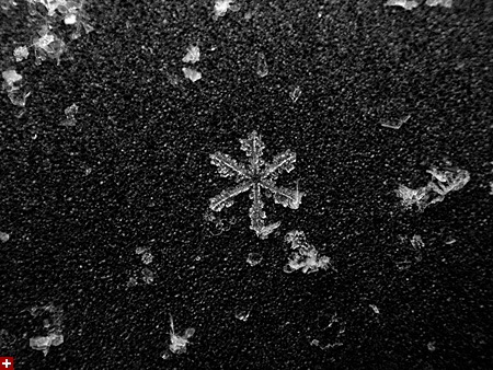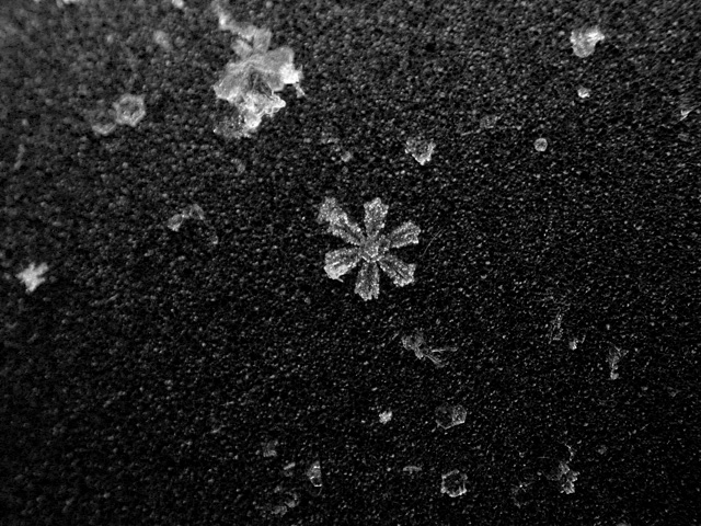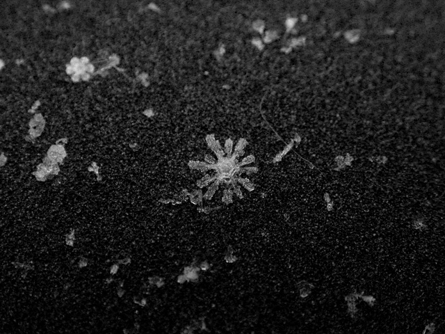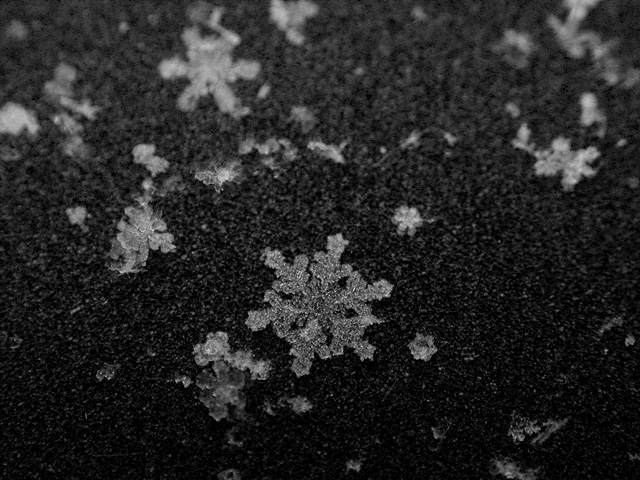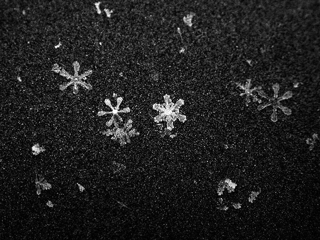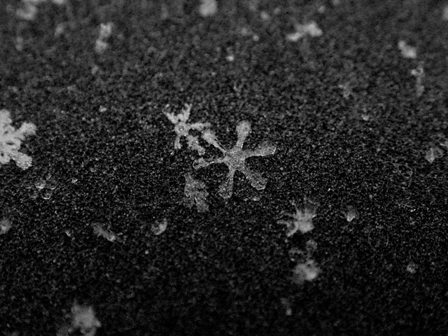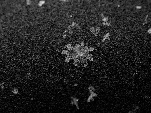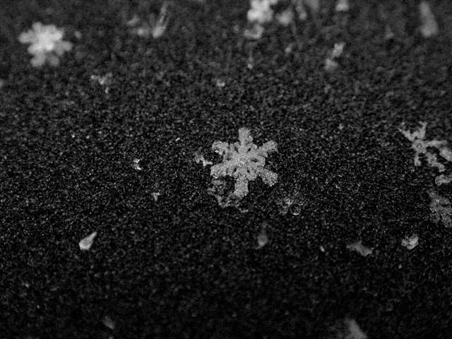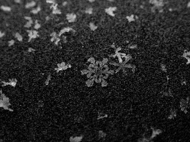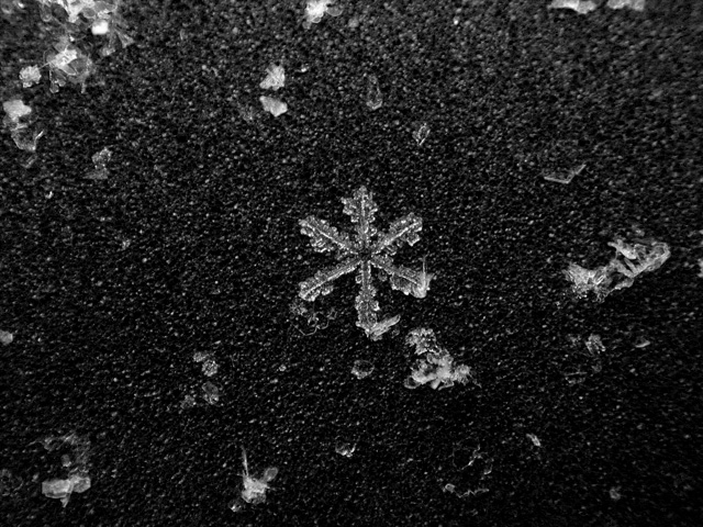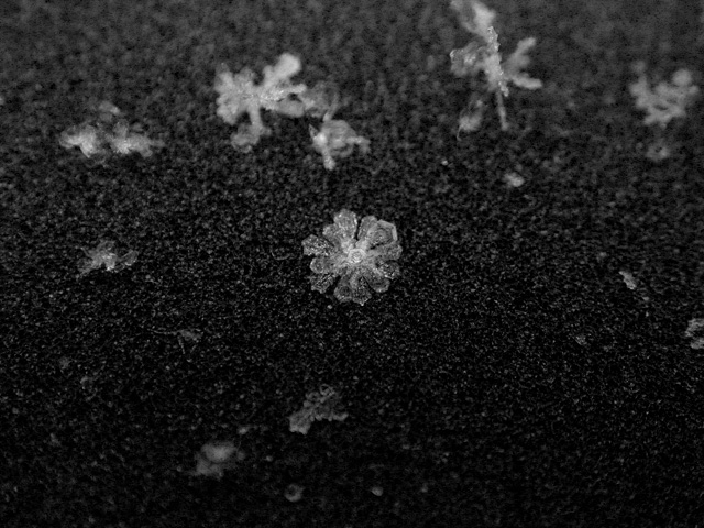 like a million tiny crystalline ninja stars falling from the sky, the snow started coming down this morning. with all this talk of global warming, who knows when's the next time i'll get to see snow again, so i went out with my camera to get some snowflake photos for the scrapbook. every winter i try to at least stop one time to admire these snowflakes. it boggles the mind that something so intrinsically beautiful and ephemeral can cause so much havoc. bruce and i tentatively agreed to do some snow walking once i found more time.
