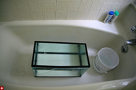 i tested my repatched aquarium for the second time. at about the 6 gallon mark i decided to play it safe and relocate to the bathroom, in case the tank should completely shatter and 10 gallons of tap water flood my kitchen floor. i filled the tank up to the rim and waited for something to happen. notice also the color of the water in the aquarium. is it just me or is it slightly blue? i've noticed this sometimes in the bathtub when i'm taking a soak and i really saw this in tokyo taking a bath in a japanese ofuro. i'm no scientist, but i guess it has something to do with the chlorine used to disinfect tap water.