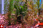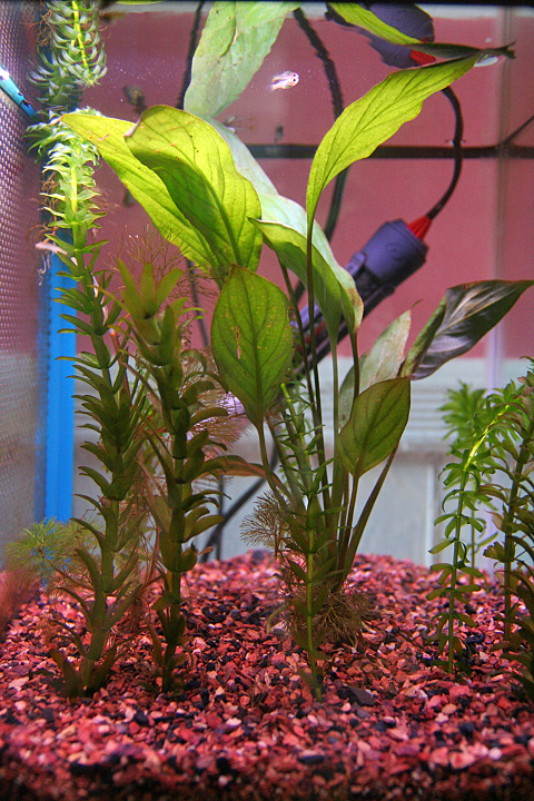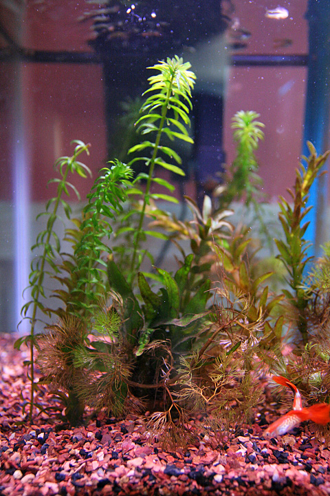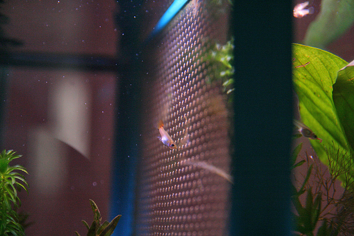 (4): the male half of the guppy tank is a rough neighborhood. the plants growing there don't seem to be doing so well and the filter constantly churn the water creating strong currents push the male guppies around.