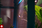 (3): the divider that separates the male guppies from the female guppies. occasionally i see the fish pecking at the divider: maybe curious about what's on the other side, but maybe also eating some of the algae that grows on it. for some reason the male half of the aquarium is really bubbly - maybe because the filter sits on that side.