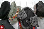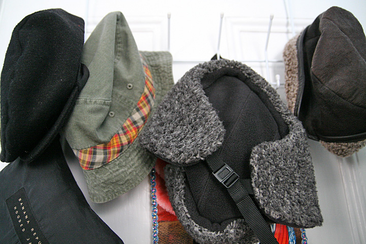 (10): the grey/black fleece hat with the flaps is my headgear of choice for cold winter days. i usually don't wear hats; it means one less thing to forget. the green hat with the strip of plaid came with me to the coat of turkey back in 2001.