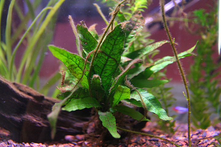 (6): every few weeks i have to gently rub the leaves of this java fern to get rid of the algae growing on it. placed on a piece of driftwood, i think it's already rooted itself by now. i have another java fern in the guppy tank that i'll eventually relocate to this 7 minibow.