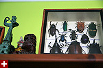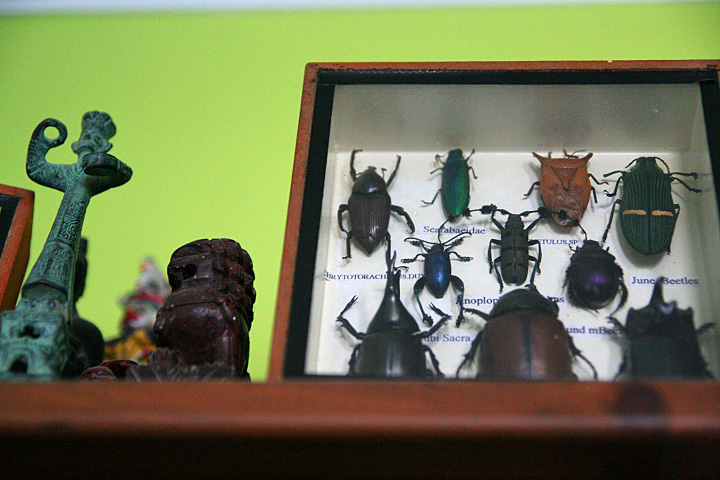 (18): box of insects also from the chiangmai night bazaar. i was afraid i'd have trouble getting it through customs but they never checked my bags and waved me through the gate. the green statue is from sanxingdui, china. the actual statue stands 8.5 feet. i waited until i got outside the museum before i bought anything (where the souvenirs were 300-400% cheaper).