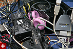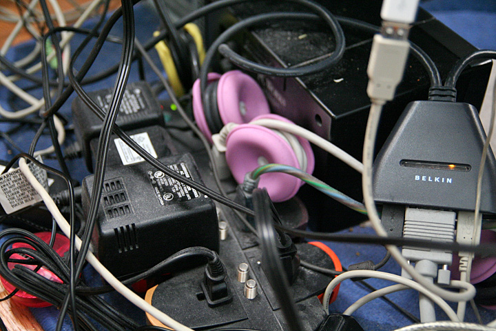 (13): underneath my desk is a fire hazard. despite my best effort to untangle the cables, it's still a cluttered mess. i use a KVM switch to toggle between my PC and my mac. occasionally the switch malfunctions and i have to unplug and replug all the usb cables to get the power back in but at least it keeps my desktop clear with just a single monitor. what i really want is an LCD monitor (all the kids are getting them these days). what i have now is a 19" sony trinitron. it's nice but it's heavy and hot. the problem with an LCD though is i may need to get a new KVM switch (one that has DVI) and i don't think they make cheap ones yet.