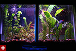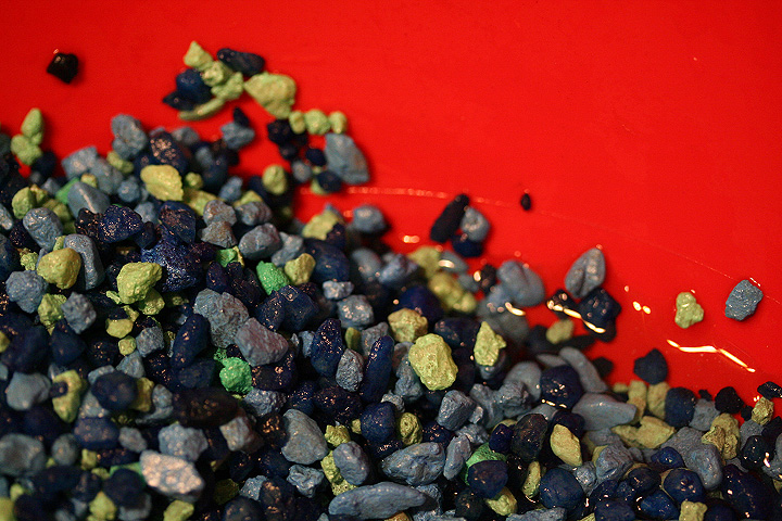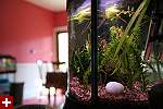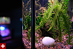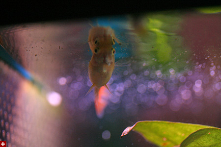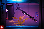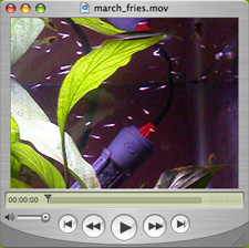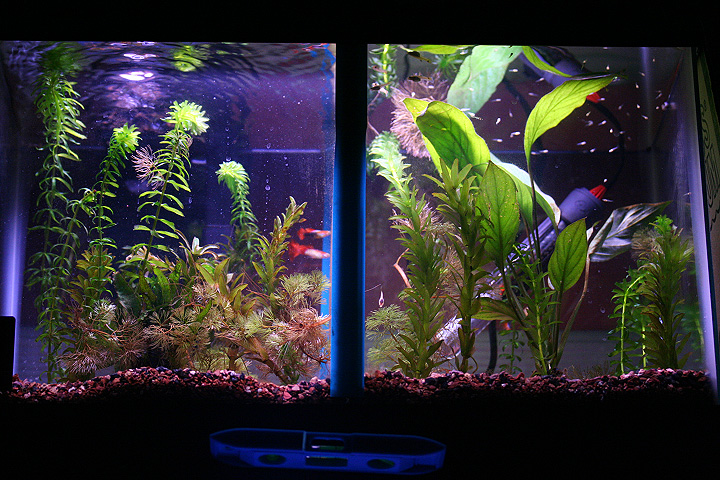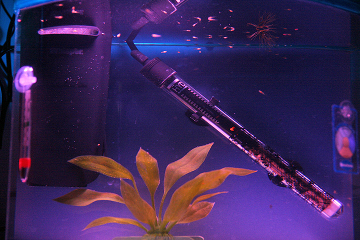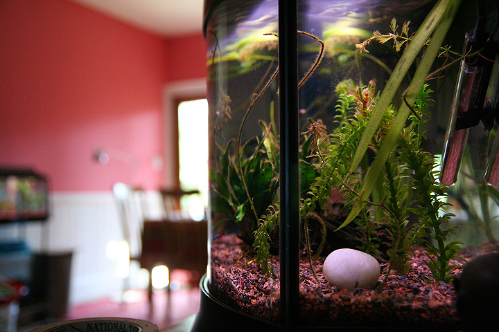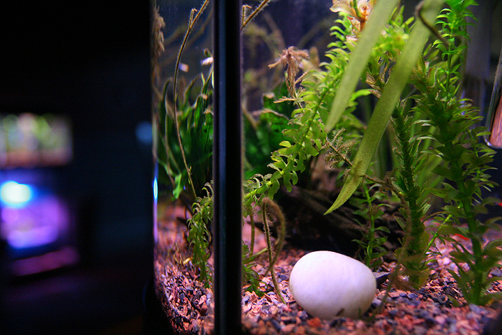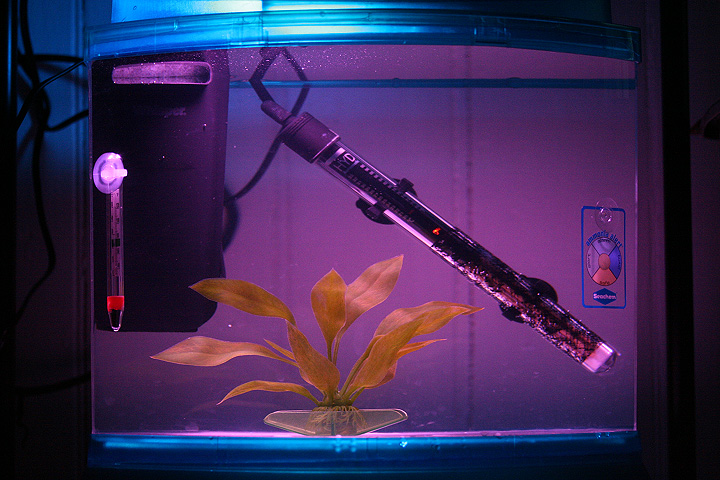 with the 5 minibow temperature finally up to 74 degrees (same as the guppy tank), it was time to relocate the fries. with a plastic cup i had the arduous task of scooping out the babies one by one and transferring them to the minibow. once they were all relocated, i feed them a combination of finely crushed fish flakes and freeze dried brine shrimps. i spent a long time watching them eat, but also making sure none of them were deformed and needed to be culled (i've yet to euthanize a single fish). i don't much like the new replacement fluorescent light bulb in the minibow: it's definitely better than the original yellow incandescent bulb, but this one gives everything a purplish UV glow, which i think is great for plants, but makes the aquarium look unnatural. maybe the next time i do a batch online fish supply order i'll look for a different bulb.