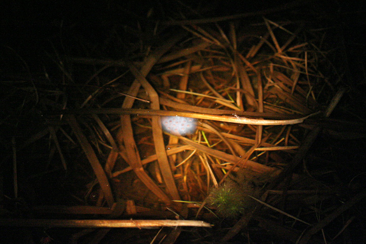in the cold wet rain we walked the trail in the dark with our flashlights. the temperature must've been in the 30's and without my gloves my hands would've been freezing cold. on either side of us were supposedly vernal pools that periodically we'd stop and scan with the flashlight beam to look for salamander signs. the temperature was definitely too cold for a mass migration (i even heard it was going to snow a little bit tonight) but we could get lucky and find a few stray salamanders who couldn't wait for the warmer weather to arrive. "here, some spermataphores!" tabitha called to everyone. it looked like somebody sprinkled tiny feta cheese crumbs on the water, but in fact these were the sperm packets of male salamanders. suddenly our light caught two salamanders thrashing in the water before disappearing underneath some submerged reed grass. my first official wild sighting! they're surprisingly big, about 4-5", black with yellow dots. they also have a weird look, a perpetual smile, similar to dolphins. for a creature this size you'd figure people would see them all the time, but apparently this is the only time of the year when you can catch them (the spring mating season) otherwise they're an extremely rare occurrence. they're also nocturnal, and most normal people don't spend their spring nights in the rain looking for critters. nearby were a ball of eggs, and next to those were large kidney-sized groupings of even more salamander eggs. the squeaky whistling chorus of spring peepers filled the air, occasionally punctuated by the trilling calls of grey tree frogs.