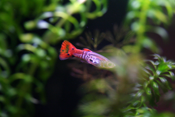 there is one new male guppy that's my favorite: he has very bold black reticulated patterning and has a pearlescent shine. in a week or so he should be developing more red coloring in the rest of his body. this is a true cobra guppy, unlike the only single surviving member of the first brood, which looks more like a tuxedo guppy.