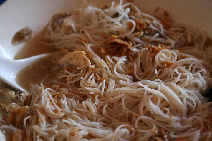 for lunch i heated the last of my chicken broth and prepared some rice noodles with a sprinkle of tianjin fermented vegetables, fried garlic, and a dash of worcester sauce. this recipe always seemed to be a secret kept by my mother, but now that i know how it's prepared, i can have it whenever i want. the best part is making the chicken broth from the leftover rotisserie chicken carcass, it's nice to recycle food! since normally i'm very wasteful when it comes to ingredients.