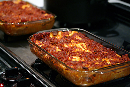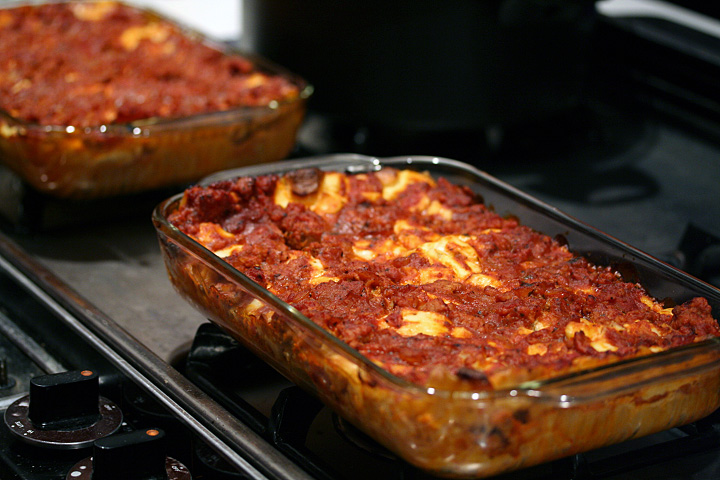 in the evening i made some lasagna for dinner. in total, including the time for the sauce to simmer and baking in the oven, it took 2 hours. the ground beef i bought a few days ago turned out to be ground pork. i noticed something was wrong when the meat turned white instead of brown after i cooked it. in the end though, it tastes about the same. i didn't have a big lasagna dish (i used it as a carrying tray when i made chinese new year flan back in february, the dishes are still at my parents' place) so i ended up using two smaller dishes.