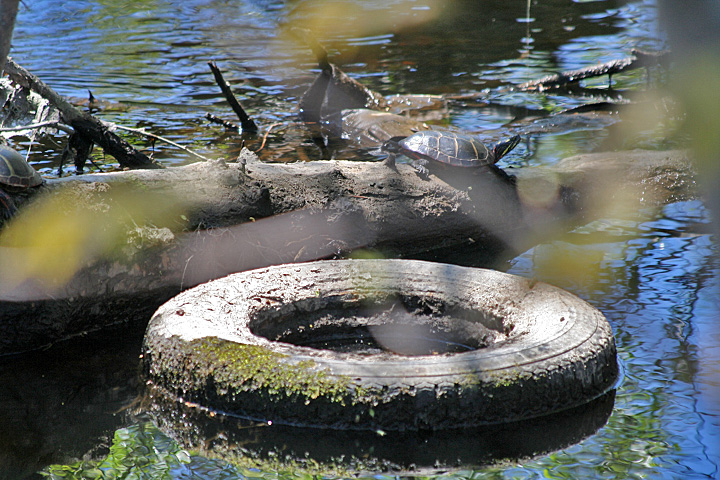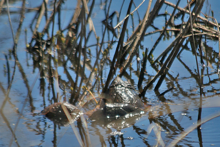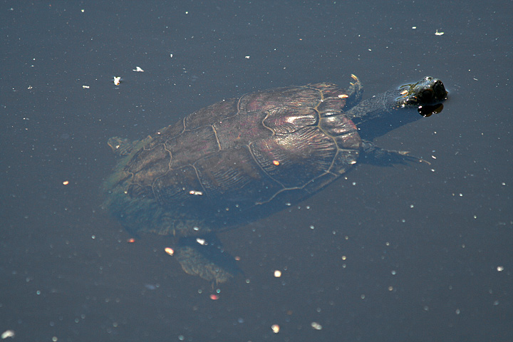 the highlight would have to be our snapping turtle sighting. while resting at one of several observation decks looking at the myriad of turtles swimming and basking below us, we suddenly saw a loud and sudden thrashing nearby. previously there was a red-winged blackbird but now we saw the upper half of a monster snapping turtle that had jumped out of the water to ambush the bird. although we only saw the upper half of its body, it must've been at least 2 feet long. the head itself was about the size of a large potato. it was a scary sight, and stayed in its half-submerged position for a little while before sinking into the water, leaving a trial of bubbles. (my first snapping turtle sighting, snapping turtle on the road, snapping turtle babies).