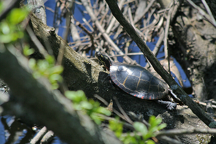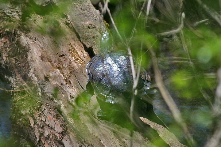 so around the river we went with susan leading the tour. she seemed to know the area well enough that she could've been a professional guide. we did see turtles, and lots of them. susan and bruce did a count, at least 30 turtles were seen before they gave up trying to keep an accurate record. some painted turtles, and a few larger ones that look to be older painted turtles (shells about the size of footballs) that have either lost their color or just covered in mud.