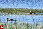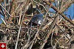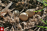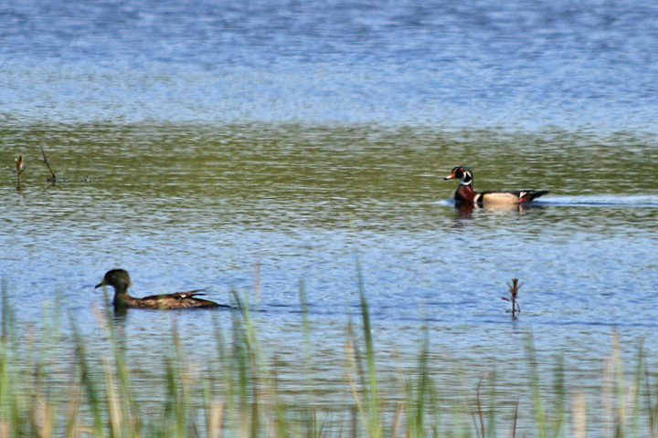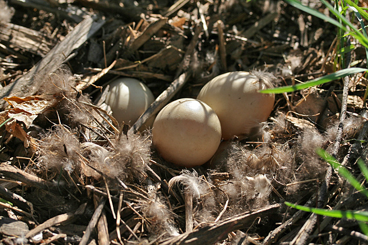 although our original primary objective was to look for birds, they were far and few in between - unless you count all the red-winged blackbirds and grackles. there was also half a dozen swan but they're common enough that i didn't even bat an eyelash or try to get a photo. coming in we saw an oriole flying overhead and located its hanging nest. there were cormorants, and canada geese, and some mallards, even a great blue heron - the usual. we did see a pair of wood ducks though, appearing out of the blue and drifting towards some reeds. they're very shy and it's hard to get close enough to get good photos. back at the parking lot, below the observation tower, a mildly retarded man (maybe he was just loud) pointed to a nest of canada geese eggs underneath the metal staircase. the nest looked abandoned because at least one of the eggs was cracked. standing within just inches to the nest, our helpful friend observed the eggs with his binoculars.