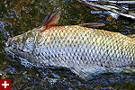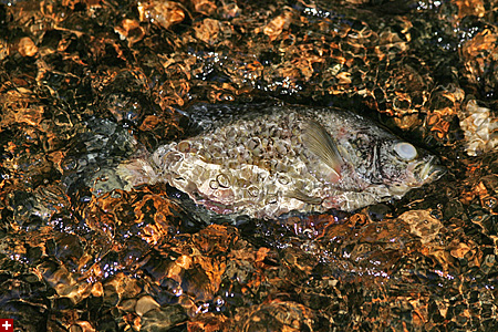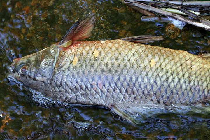 jesse and i made a loop around the water. at the outflow end where the marsh drains into the concord river, there were some dead fish. most striking was a large carp, about 18" long. there were also some other smaller unidentifiable fish.