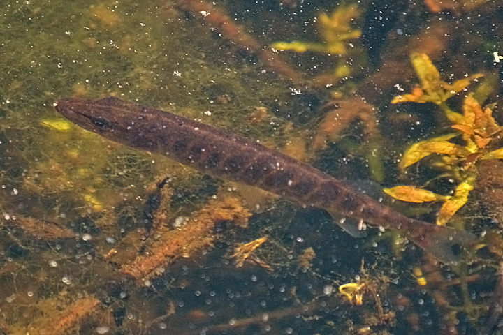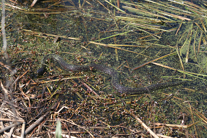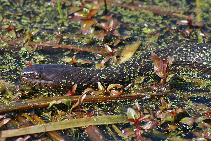 early on we saw a long black snake swimming through the duckweed. it was about 2 feet long and even though it was hard to see its characteristic colors and patterns, from the shape of the head i could tell it was a water snake (their jaws sort of bisect their heads exactly in half, unlike most other snakes where the lower jaw is always smaller).