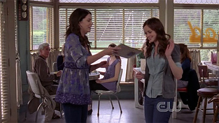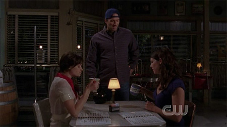 before rory leaves, they visit the diner one last time. the girls are teasing luke, as usual. lorelai can't decide what she wants, luke tells her "you can take as long as you want." tear.