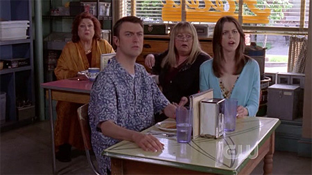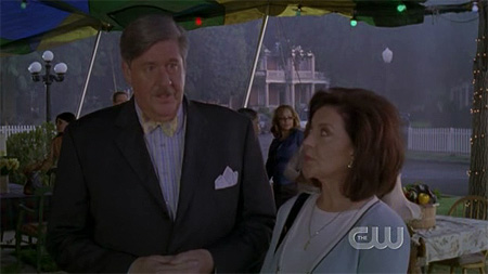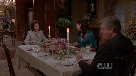 ah, the family dinner! didn't lorelai's parents split up? nice to see that they're back together. i've always wondered about this: why is edward herrmann (lorelai's father) always credited as "special appearance"? it's always made me think that he will only appear on a few episodes, or that one day he'd be written out of the story entirely, but he seems to be a pretty consistent fixture in most episodes.