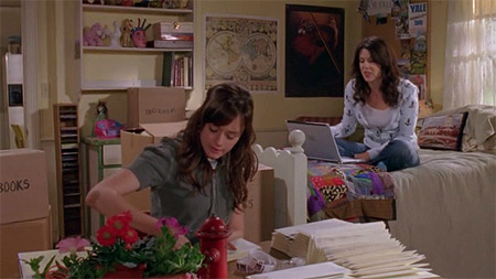 rory is mailing out a million resumes before mother and daughter go off on a road trip visiting rollercoasters. look, there's a fire hydrant on the desk! is that a pc? or a mac disguised as a pc? hard to tell. those are obviously fake flowers though.