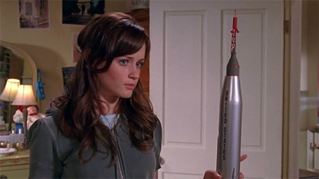 okay, awkward moment...a rocket? i totally missed this story (maybe i don't want to know). i'm assuming it's a present of some sort from rory's ex. i've seen an episode or two to know he's some rich boy. in my mind, jess was the one that got away, the bad boy but who's secretly super smart. as for rory's first boyfriend dean, he was just training wheels, no way was that ever going to stick.