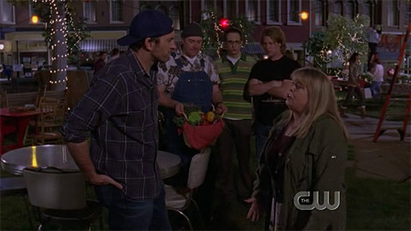 luke! and who's this other person? luke's sister? and she has a baby? the whole reason why she's here is so she can remind the audience that luke has a special present (necklace) that he was going to give to lorelai but he might give it to rory now, as a graduation present. foreshadowing, anyone?