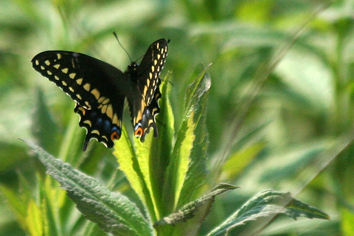 sure enough, there were some butterflies that were already visiting. the only one that approached close enough for me to get a good look (as well some photos) was a black swallowtail, which i've never seen before (compare and contrast with the tiger swallowtail i saw a few weeks ago). (so that fulfilled my quota of seeing something new every time i go out naturing).