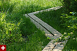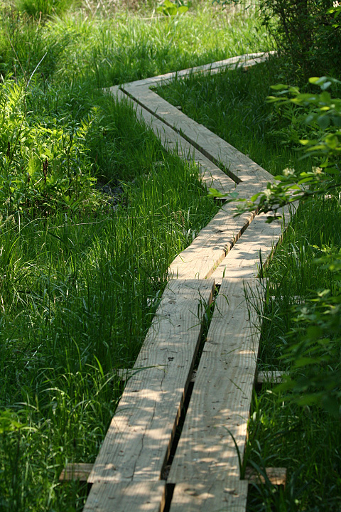 a zigzagging boardwalk cut through a muddy marsh before coming into a shady wooded forest, a carpet of red pine needles coating the ground. a small wooden bridge spanned a gentle babbling brook, and the place had a very serene feeling to it. unfortunately, this was also where the mosquitoes started to appear.