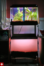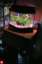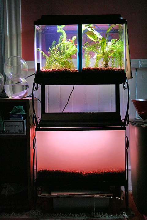 the fun didn't stop there, in fact it was just starting. next i set up the old fish stand in the guest bedroom and filled up both aquariums. looking at the empty repaired aquarium (the one with the siliconed crack), i decided to take a gamble and set it up on the old stand and then fill it to see if it'd fail or not. 10 gallons of water later, it was still holding. not sure if i'd ever use it permanently but it makes a nice temporary tank, for when i eventually have to move the guppy fries from the 5 gallon minibow and separate them out according to gender.