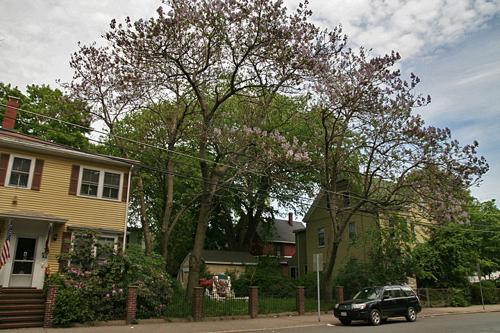 a week ago i noticed a large purple flowering tree on 207 beacon street in somerville and i've been meaning to go back to get some photos and find out what kind of tree it was. turns out it's a paulownia AKA princess tree. the clusters of purple flowers not only resemble orchids but are fragrant as well. leaving beacon street, i paid a visit to another flowering tree, a black locust on the corner of prentiss and oxford street. locusts are a weird sort of tree (i have a honey locust growing in front of my house), belonging to the pea family and their seeds come in long sticks that look like giant pea pods. if you're at all familiar with what pea flowers look like, the flowers on the black locust look exactly alike.