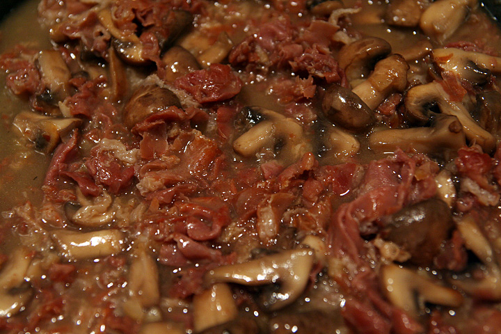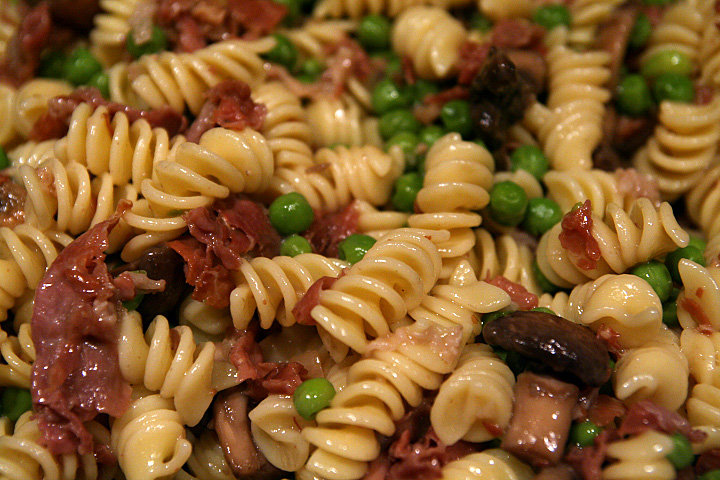 then i came across this pea recipe. i can't remember ever cooking with peas before; not that i don't like peas, but i've always found them to be a boring ingredient. the recipe called for 8oz. of rotini cooked simultaneously with the peas in a pot of boiling water. while that's going on, i made the sauce: quarter pound of prosciutto cooked with olive oil for a few minutes, then i added some chopped garlic, followed by 2 cups of crimini mushrooms,